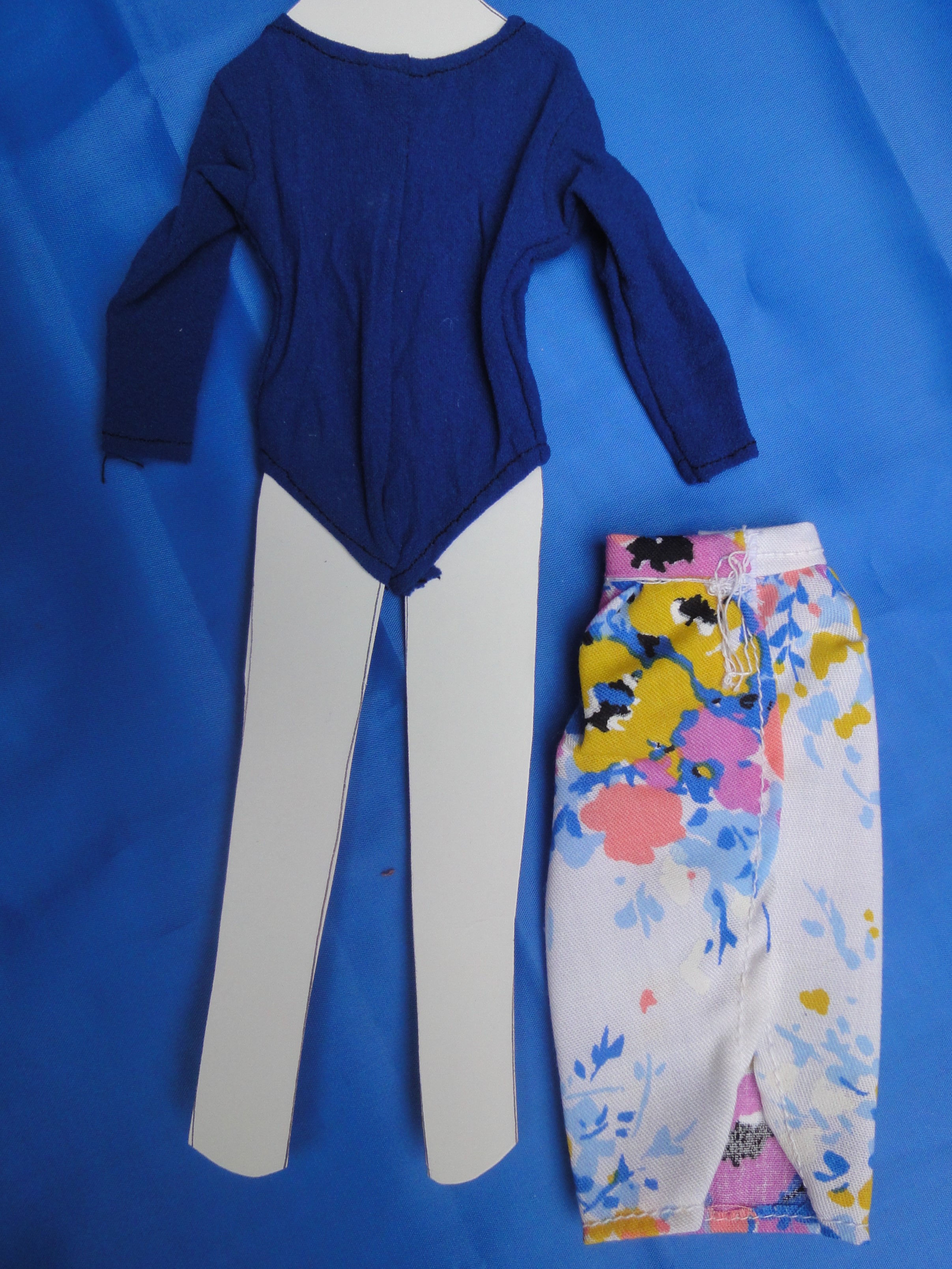 Workout Suit and Cover-up Skirt B26 Here is a long sleeve Work out "suit" of a blue stretch material with the skirt being a floral print on a white background. The top and skirt close with Velcro to help little fingers while dressing the doll. These are made from polyester/cotton blends. Most materials I use have been remnants saved from other projects, or store remnants and can be machine washed and dryer dried, unless specified otherwise. I make many other styles and can take special orders for other custom made outfits.