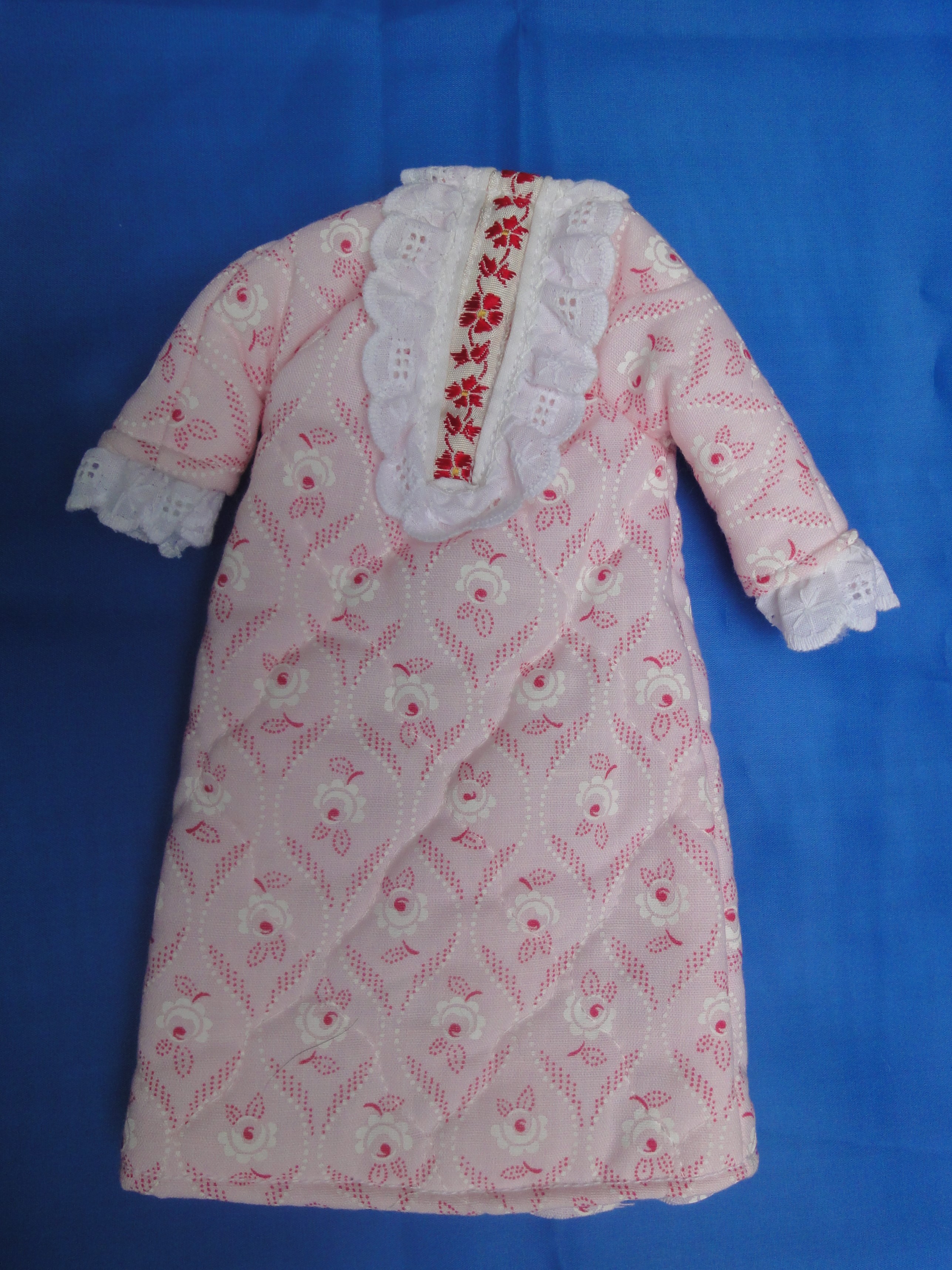 Quilted Robe B27-2 This quilted robe is made from a material with a pink background, white glowers, and pink accent design. At the hem of the long sleeves is white eyelet lace which matches the lace on the front bodice. there is also an inset of red flowers on white. The back closes with Velcro to help little fingers while dressing the doll. These are made from polyester/cotton blends. Most materials I use have been remnants saved from other projects, or store remnants and can be machine washed and dryer dried, unless specified otherwise. I make many other styles and can take special orders for other custom made outfits. |
