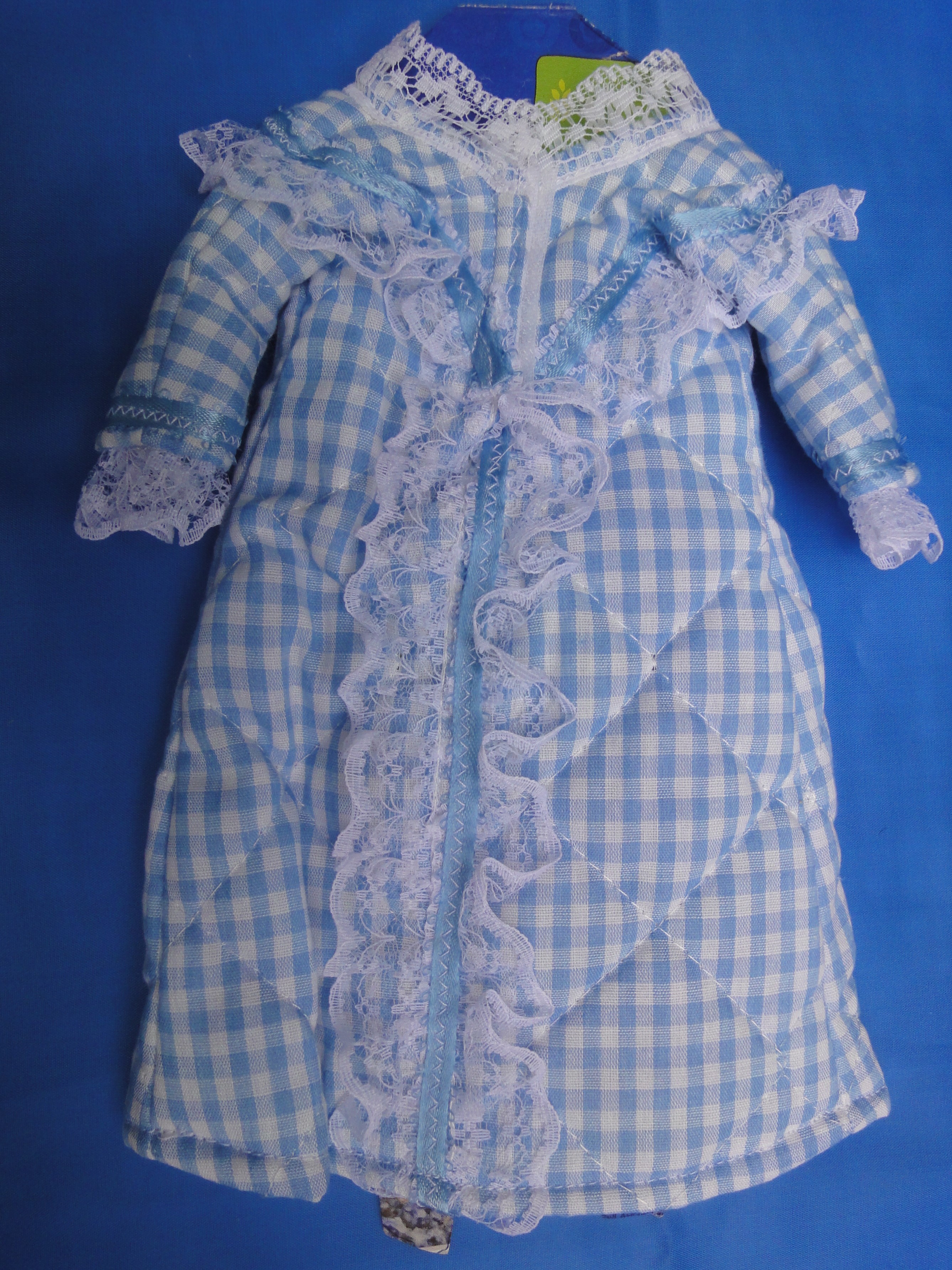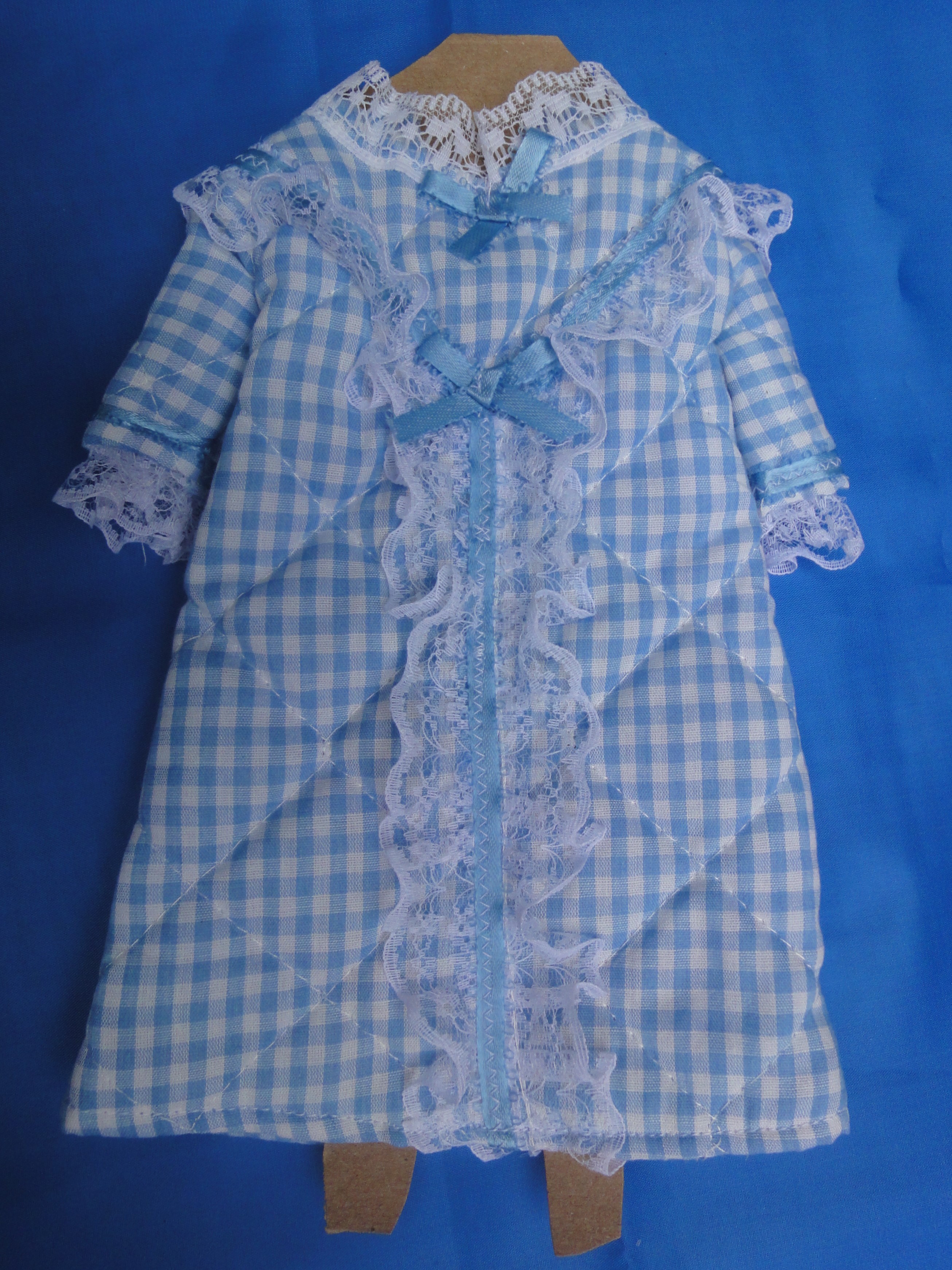 Quilted Robe B27-3a This quilted robe is made from a pale blue and white check material. At the hem of the long sleeves is white lace and blue ribbon trim which matches the lace on the front bodice. Two tiny blue bows accentuate the front, but not the back, however, the back closes with Velcro to help little fingers while dressing the doll. These are made from polyester/cotton blends. Most materials I use have been remnants saved from other projects, or store remnants and can be machine washed and dryer dried, unless specified otherwise I make many other styles and can take special orders for other custom made outfits. |