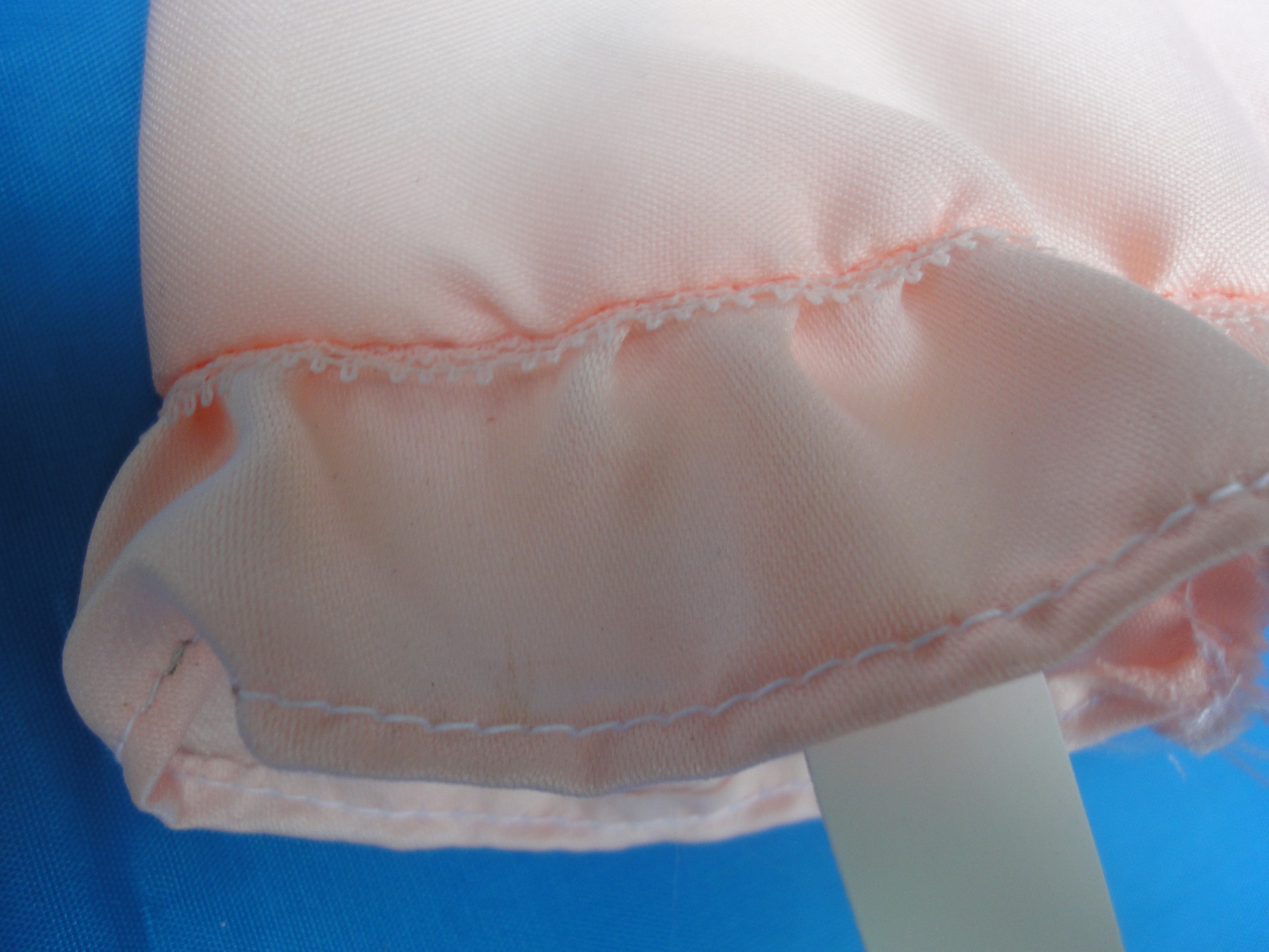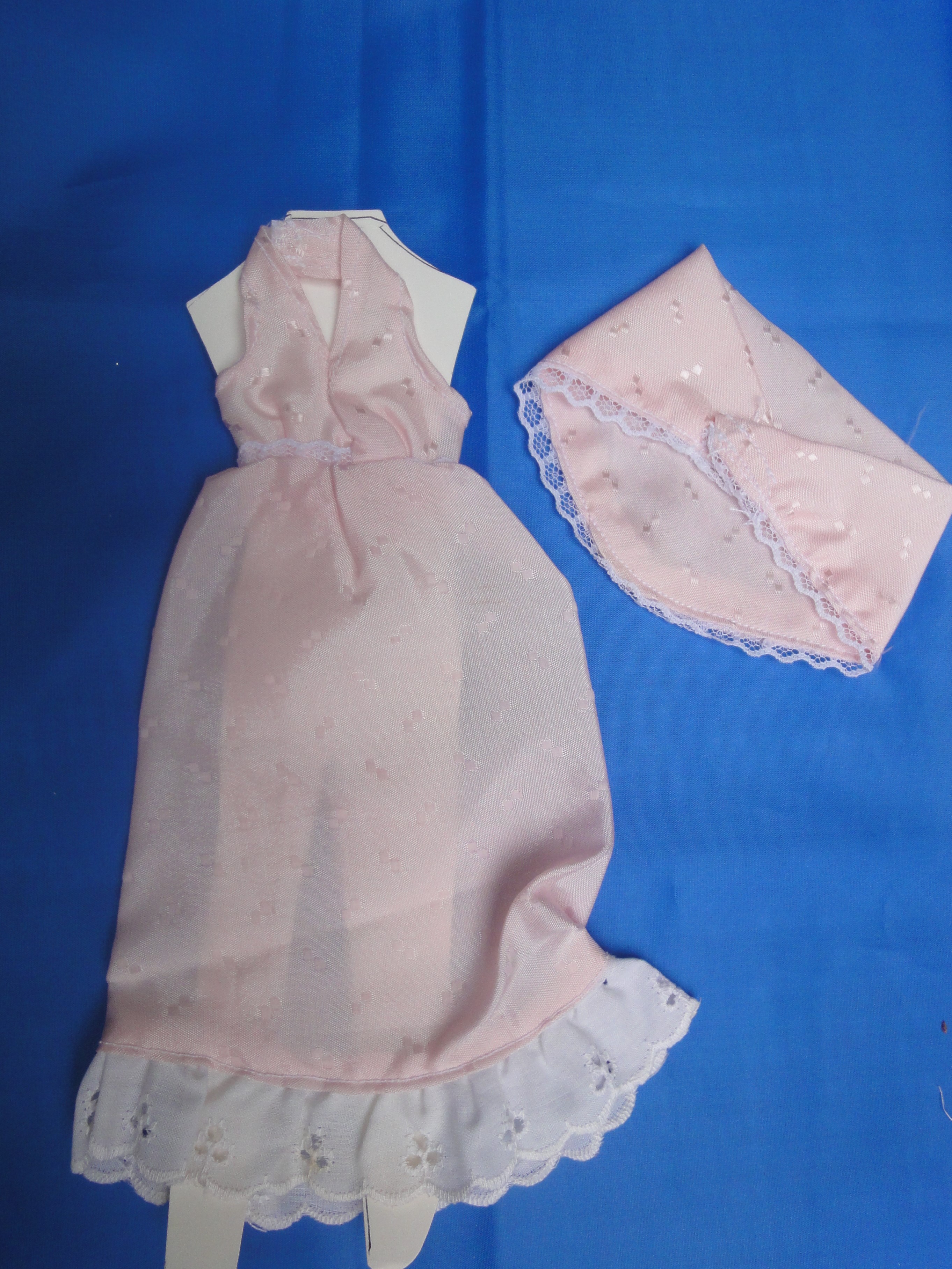 V-Neck Gown & Shawl B28-1 This outfit is a floor length gown featuring straps on the bodice which close behind the neck, forming a "V" front neckline. This fabric is a pale pink brocade with white eyelet lace on the hem. Also is lace around the waist, and the shawl. The dress closes in the back and the shawl closes with Velcro to help little fingers while dressing the doll. These are made from polyester/cotton blends. Most materials I use have been remnants saved from other projects, or store remnants and can be machine washed and dryer dried, unless specified otherwise. On this outfit I, personally, would hand wash the skirt and jacket. I make many other styles and can take special orders for other custom made outfits. |