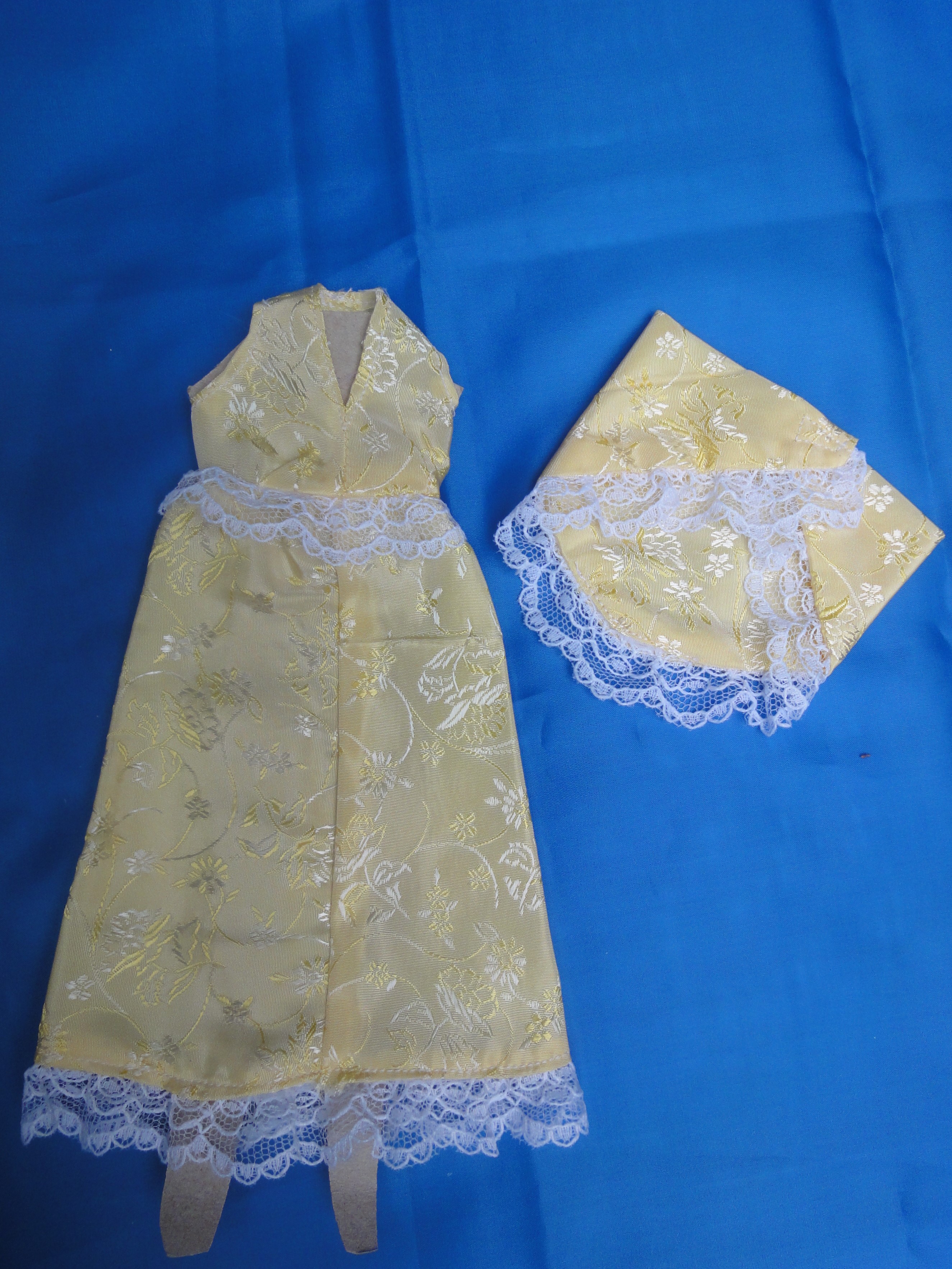 V-Neck Gown & Shawl B28-2a This outfit is a floor length gown featuring straps on the bodice which close behind the neck, forming a "V" front neckline. This fabric is a pale yellow brocade with white lace on the hem. Also is lace around the waist, and the shawl. The dress closes in the back and the shawl closes with Velcro to help little fingers while dressing the doll. These are made from polyester/cotton blends. Most materials I use have been remnants saved from other projects, or store remnants and can be machine washed and dryer dried, unless specified otherwise. On this outfit I, personally, would hand wash the skirt and jacket. I make many other styles and can take special orders for other custom made outfits