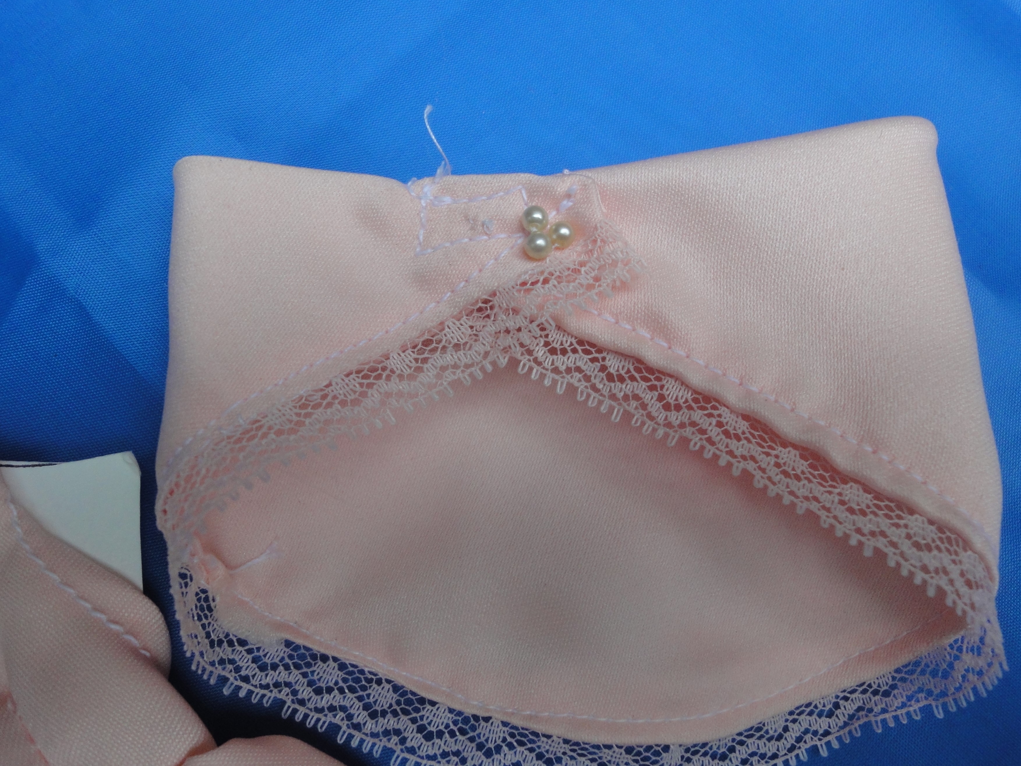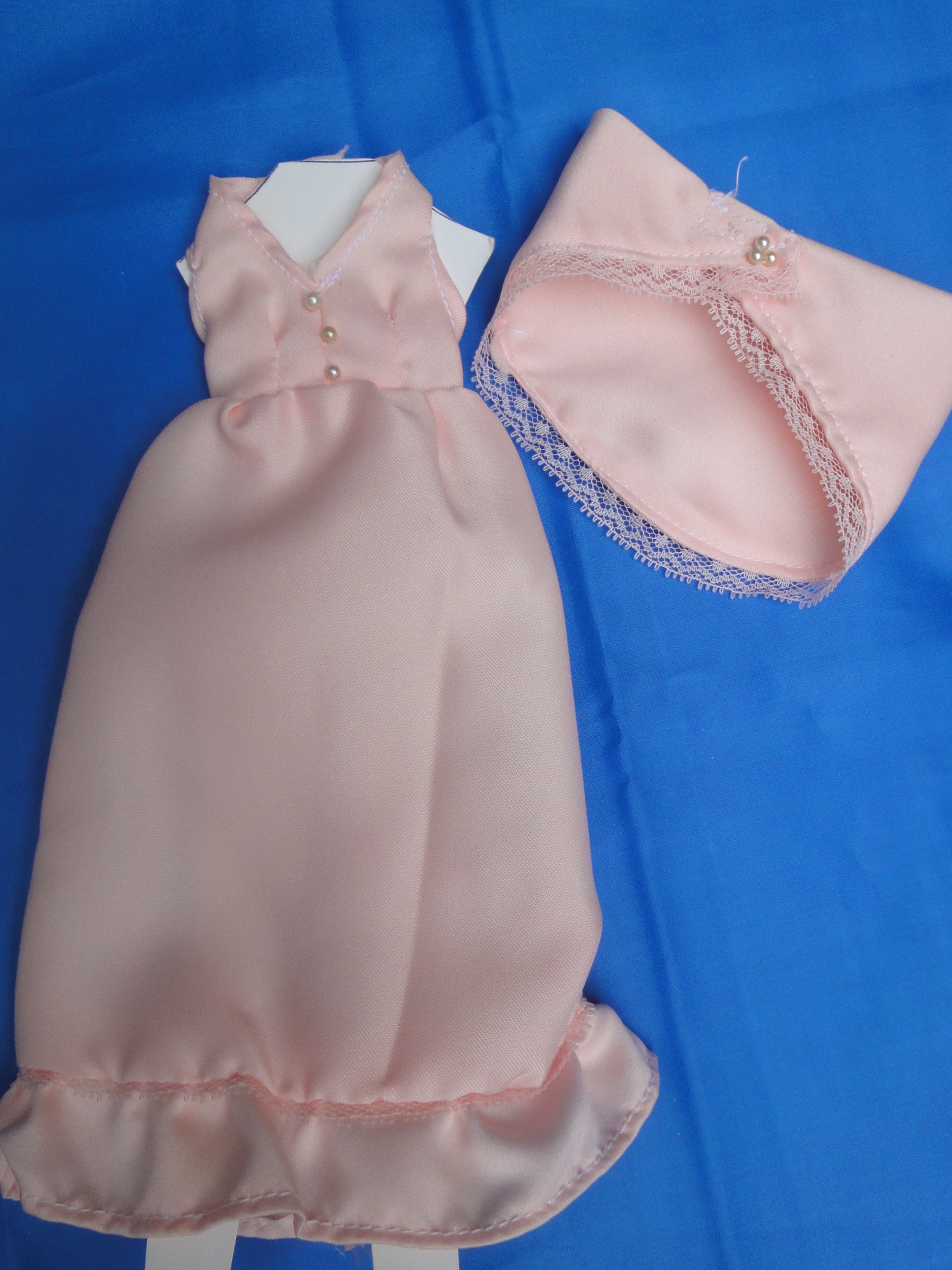 V-Neck Gown & Shawl B28-3a This outfit is a floor length gown featuring straps on the bodice which close behind the neck, forming a "V" front neckline. This fabric is a pale pink with white lace on the hem and 3 tiny "pearls" on the bodice. Also is lace around the shawl with 3 pearls on the closure. The dress closes in the back and the shawl closes with Velcro to help little fingers while dressing the doll. These are made from polyester/cotton blends. Most materials I use have been remnants saved from other projects, or store remnants and can be machine washed and dryer dried, unless specified otherwise. On this outfit I, personally, would hand wash the skirt and jacket. I make many other styles and can take special orders for other custom made outfits. |