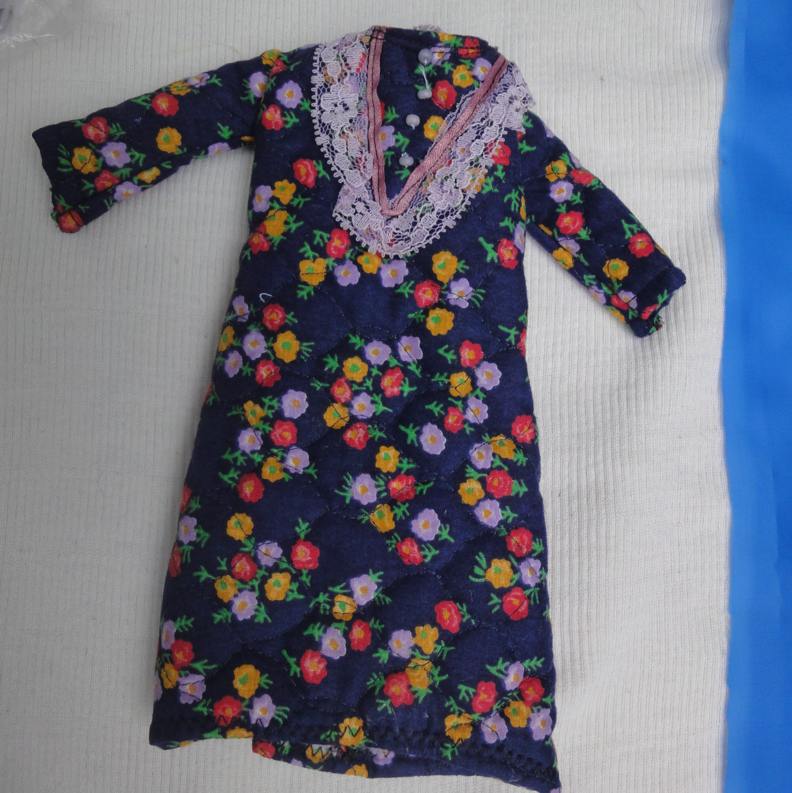 Quilted Robe B27-3a This quilted robe is made from a pale blue and white check material. At the hem of the long sleeves is white lace and blue ribbon trim which matches the lace on the front bodice. Two tiny blue bows accentuate the front, but not the back, however, the back closes with Velcro to help little fingers while dressing the doll. These are made from polyester/cotton blends. Most materials I use have been remnants saved from other projects, or store remnants and can be machine washed and dryer dried, unless specified otherwise I make many other styles and can take special orders for other custom made outfits. |