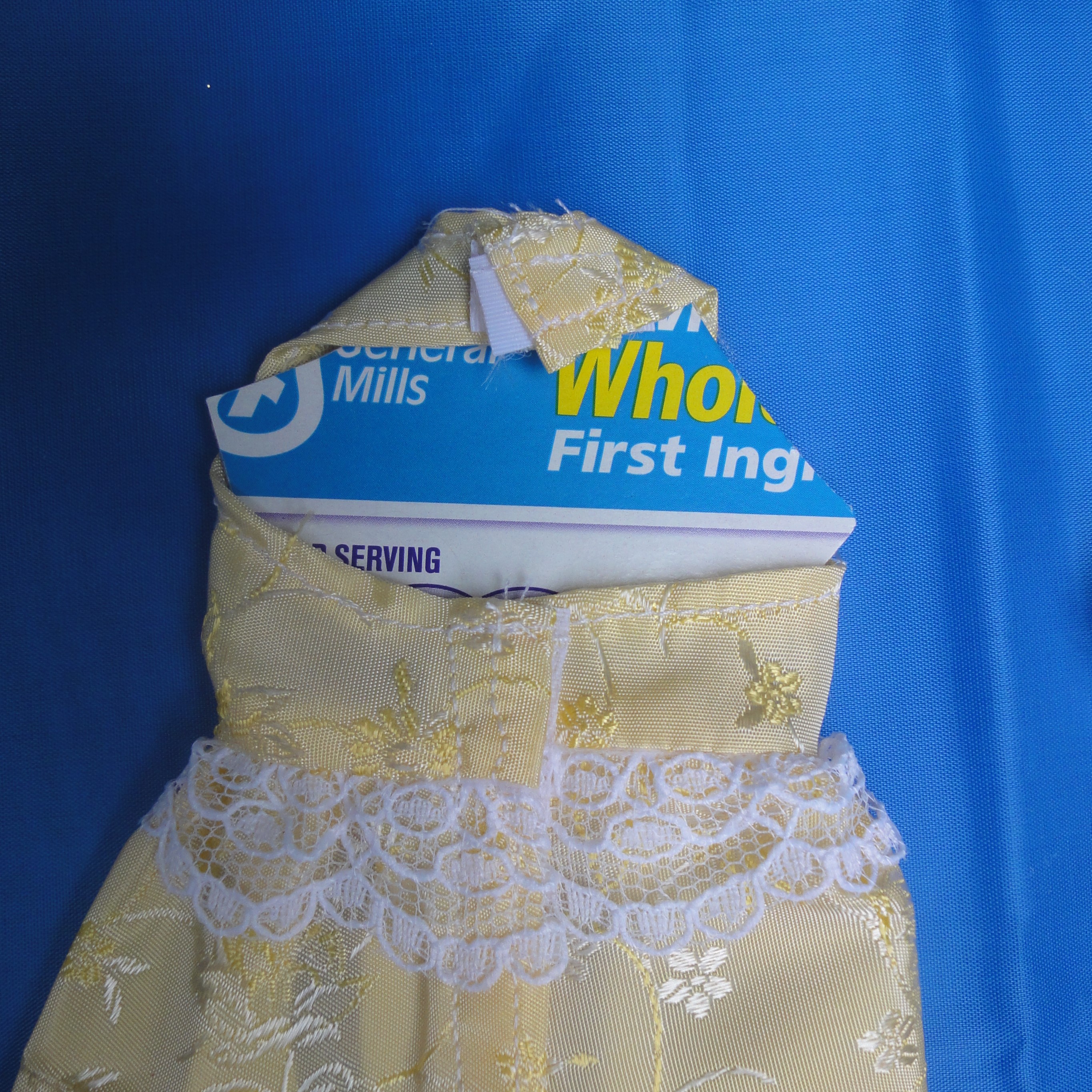 V-Neck Gown & Shawl B28-2a This outfit is a floor length gown featuring straps on the bodice which close behind the neck, forming a "V" front neckline. This fabric is a pale yellow brocade with white lace on the hem. Also is lace around the waist, and the shawl. The dress closes in the back and the shawl closes with Velcro to help little fingers while dressing the doll. These are made from polyester/cotton blends. Most materials I use have been remnants saved from other projects, or store remnants and can be machine washed and dryer dried, unless specified otherwise. On this outfit I, personally, would hand wash the skirt and jacket. I make many other styles and can take special orders for other custom made outfits